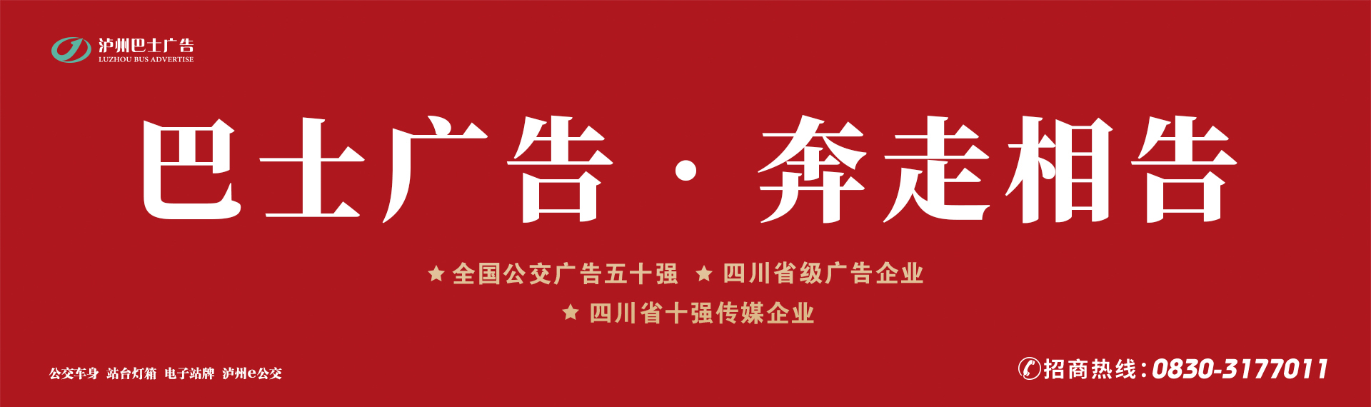 瀘州公交巴士廣告公司創(chuàng)建于1992年3月,是瀘州城市公交廣告媒體唯一經(jīng)營單位,媒體傳播及綜合影響力在同行業(yè)中穩(wěn)居前列。一直以來,秉承著“依法治企、制度管理、誠信為本、創(chuàng)新超越”的治企理念,立足城市公交服務(wù),開展實施“文化+公交”服務(wù)模式,圍繞“一線一特色”,為企業(yè)傳播價值,為社會傳遞正能量。