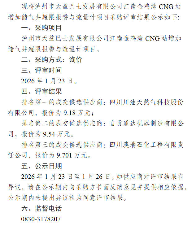 瀘州市天益巴士發(fā)展有限公司江南金雞灣CNG站增加儲氣井超限報警與流量計項目采購評審結果公示